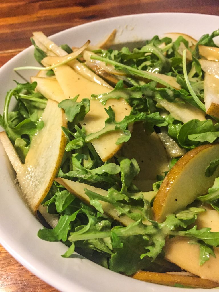 Strolling through the grocery store on my way home I spied the Anjou pears and finally I have an idea. I had made a salad of spinach and pears so I grabbed the pear and went home to make dinner. My son asked, that I not add the onion into the salad (later he admitted that the onions added a balance to the flavors and they were missed) so in went the greens and thinly sliced pears.