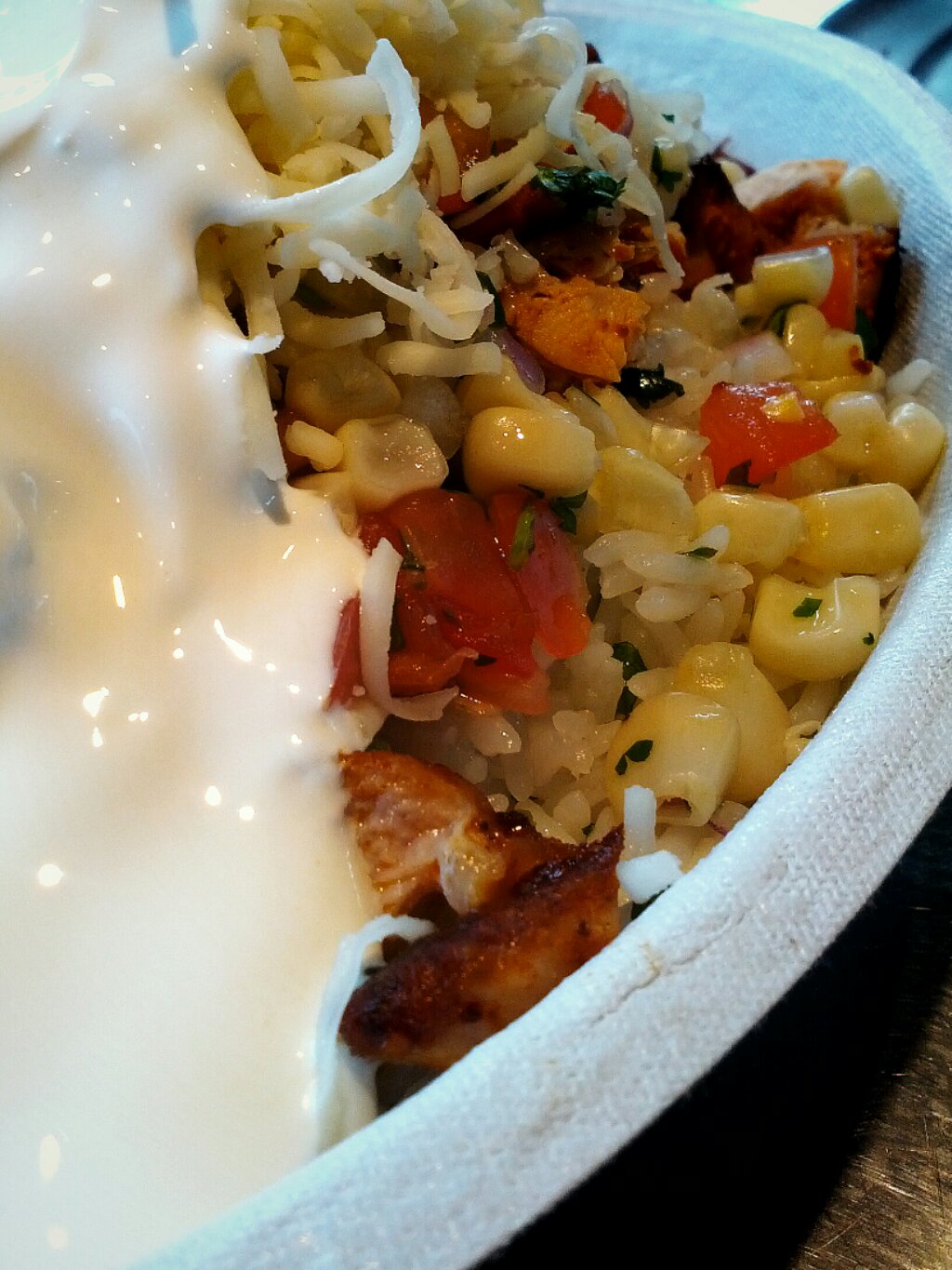 I know that I have a thing about starchy foods. Potatoes, breads, pastas, and rice all really lure me to the table. On this particular evening, the cilantro lime rice at the base of a chicken burrito bowl from Chippolte is perfect for me. Now, as much as I like starches it rivals my disdain for beans. From childhood I have not been able to develop a taste for them so, they do not make it to my bowl. Finished off with mild tomato salsa, corn salsa, and sour cream and my bowl is ready to devour.