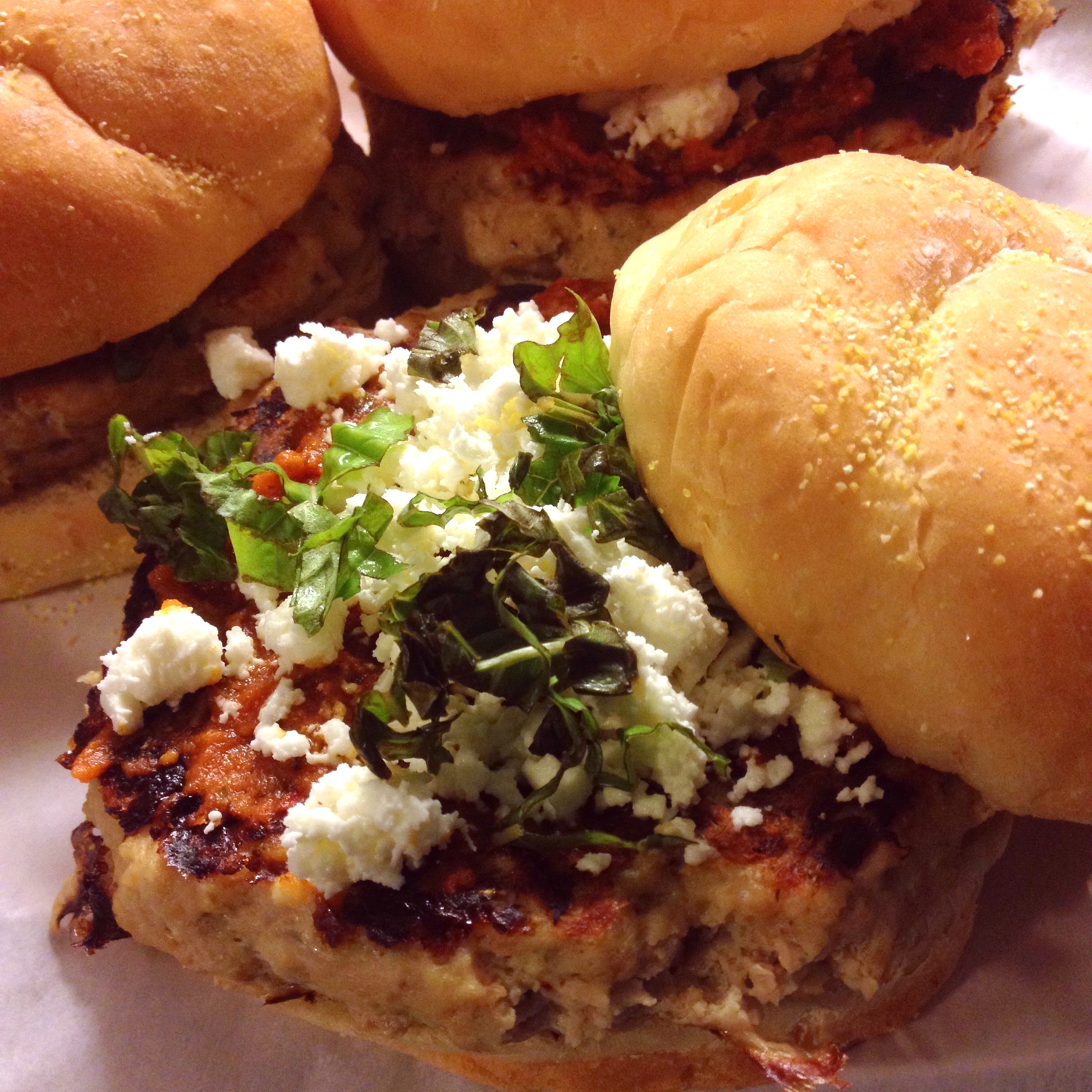 After checking out a few recipes I get a general idea of what I will and will not do. I stopped by the grocery store to pick up ground chicken, buns, and, of course, basil. The rest of my ingredients, (garlic, onion, egg, bread, butter, sundried tomato pesto, seasonings, and feta cheese) were already at home. After a bit of a drive, we arrive home and I assemble the ingredients into patties and cook them on my George Foreman grill. The patties were removed and topped with sundried tomato pesto, fresh basil, and feta. All things considered, it turned out okay.